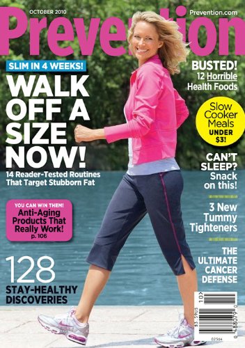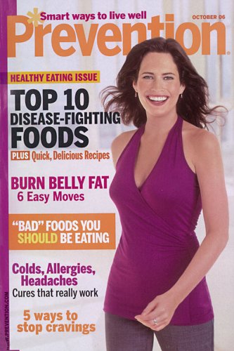 So what can a reader expect to find in her issue Prevention Magazine? On the cover she'll see a photo of an attractive female celebrity, someone in her late 30's to mid 40's who appears to be in picture perfect condition. Within the covers she'll find articles about: beauty regimens and products, workouts, healthy foods, tummy trimming foods and exercises, healthy recipes, and money saving tips.
